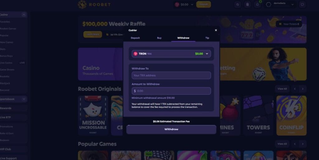 To make a deposit, simply click the gold “Deposit” button. Then, select your desired cryptocurrency and network, and copy or scan the Roobet deposit wallet address. Open your source crypto wallet and set up a transfer to your Roobet wallet. Most deposits will clear within minutes, though there can be delays due to network congestion.