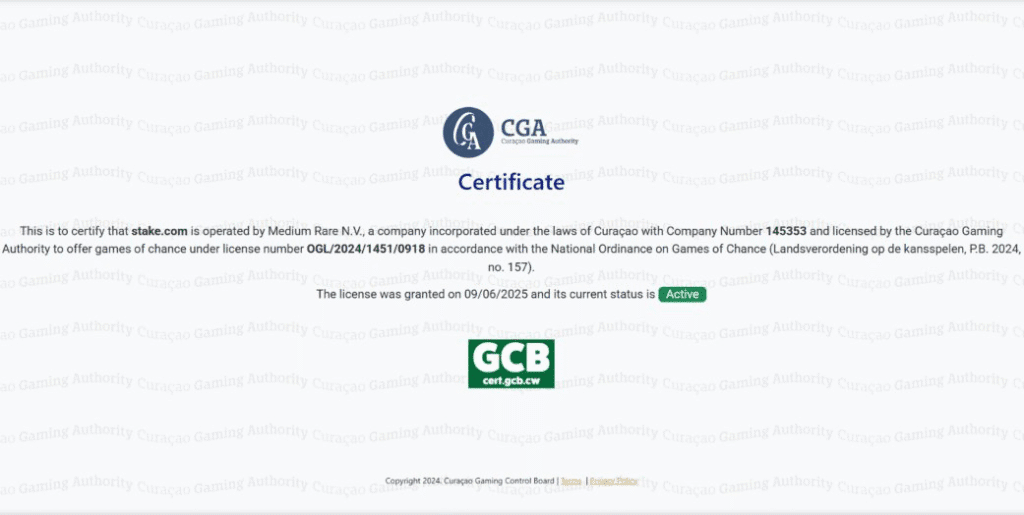Stake is owned and operated by Medium Rare N.V., which is based in Curaçao (reg. no. 145353). It is licensed by the Curaçao Gaming Authority (CGA) with licence number OGL/2024/1451/0918).