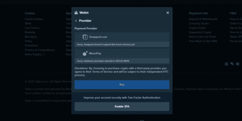 Like all the best crypto casinos, Stake allows you to purchase cryptocurrency on-site via third-party providers. Just open your wallet, tap “Buy Crypto”, then select the specific crypto and enter the amount (in local currency) you wish to purchase. Next, click “Buy” and you’ll be presented with the available options, for example, MoonPay and Swapped.com.