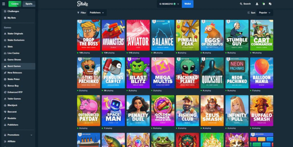At the time of writing this Stake review, the platform  offered around 3,500 casino games of all types from 50 providers. And while that’s nothing to be ashamed of, it’s actually considerably fewer games and publishers than many other crypto casinos. On the whole, the Stake lobby is well organized, with useful categories including Stake Exclusives, Bonus Buy, and Enhanced RTP.