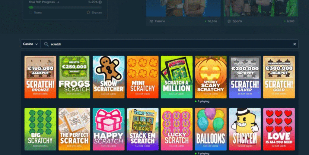 Other instant wins, like digital scratchcards, are also available at Stake, but you’ll need to use the search function to find them. For example, there’s a decent range of scratch games from Hacksaw, including Scratch! Bronze and Scratch! Gold, Frogs Scratch, and Scratch a Million.