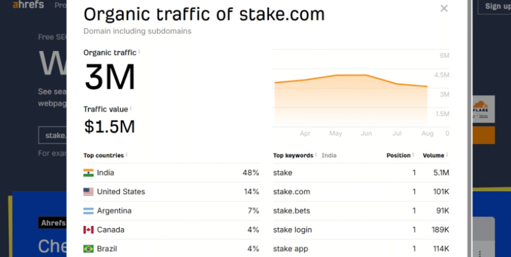 This also explains why, according to Ahrefs, at the time of writing 48% of Stake organic traffic was coming from India – one of the few major markets still served.