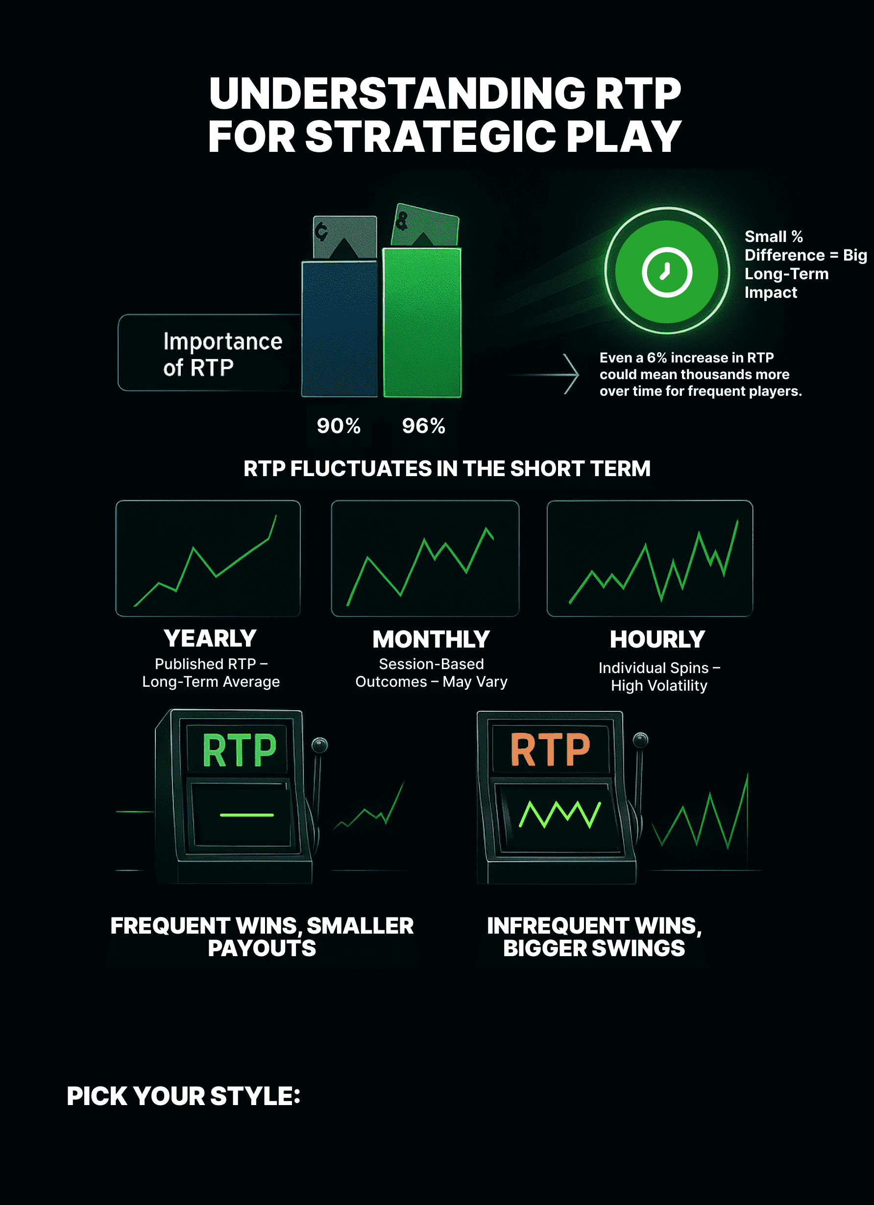 Again, here it is critical to consider scale. If you intend on playing steadily over the long term, then you may want to stick with high RTP, low volatility games. This will give a higher chance of steady, consistent returns. While if you only intend to play in short sessions, high volatility games with lower RTPs may be worth risking if you want to see any big wins.
