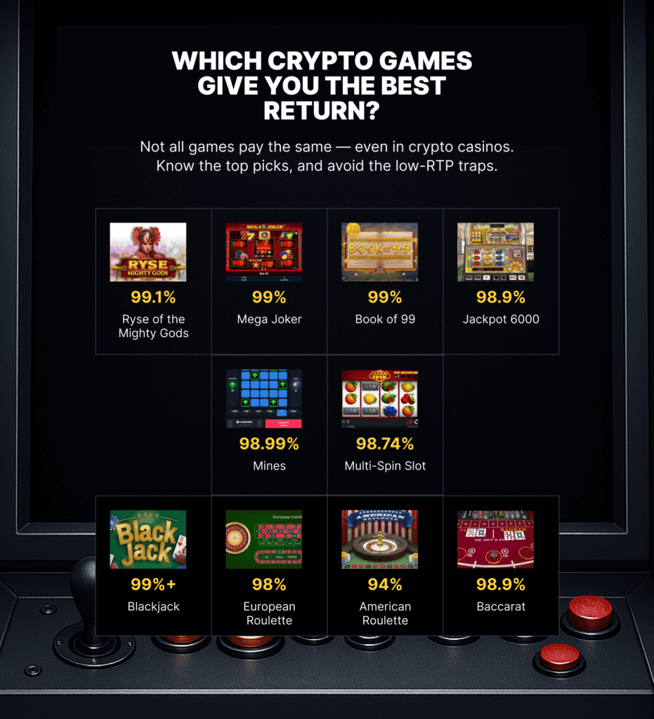 The RTP of specific crypto casino games can vary significantly, even when comparing the same type of game. So, let’s look at what you can expect.